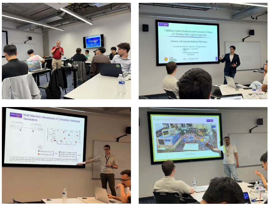 During the morning opening ceremony on August 12, Prof. Wang Zhongdong delivered a welcome speech, introducing the history and research directions of Manchester’s Electrical Engineering Department and the planned Tsinghua-Manchester joint PhD program, warmly welcoming the visiting Tsinghua delegation. Doctoral student Bai Xinpeng (admitted in 2022) introduced the EEA and the main research directions of the visiting team. During the formal forum, doctoral students Yan Yunqi and Bai Xinpeng (admitted in 2022) and Huang Kaidi and Wang Yunfei (admitted in 2023) presented academic reports on generative AI, plasma technology, microgrid operation, and high-capacity converters, fostering extensive academic exchange with warm responses from both Tsinghua and Manchester participants.