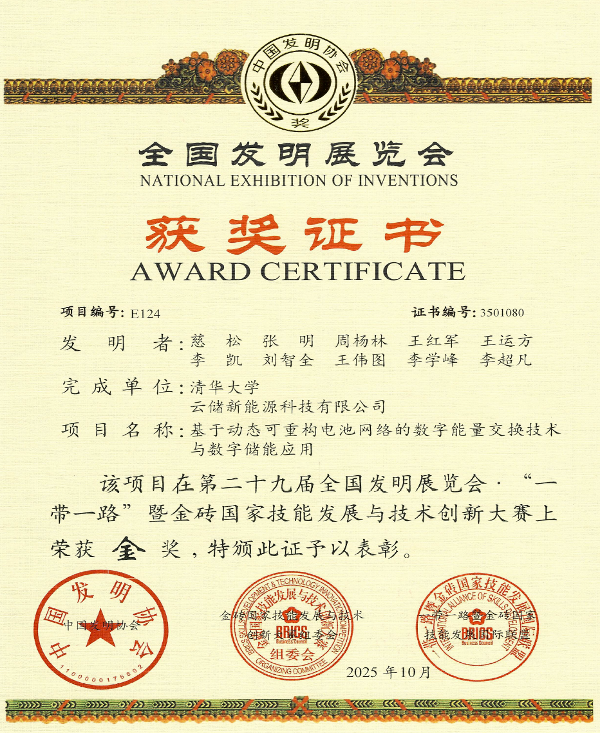 The 29th National Exhibition of Inventions was held from October 17 to 19, 2025, at the Shijiazhuang International Convention and Exhibition Center (Zhengding). The project from Tsinghua University led by Researcher Ci Song, titled “Digital Energy Exchange Technology and Digital Energy Storage Applications Based on Dynamic Reconfigurable Battery Networks,” won the Gold Award. Researcher Ci Song is the primary inventor of the project, and Tsinghua University is the primary completing institution.