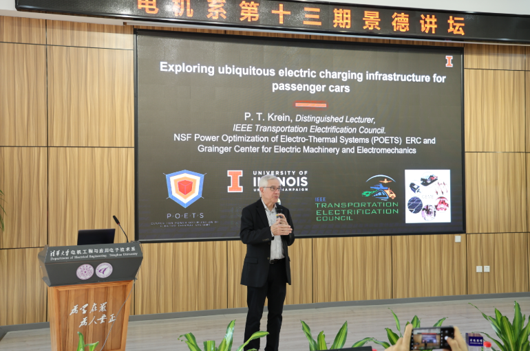 During the invited lecture, Professor Krein first presented on the topic “Exploring Ubiquitous Electric Charging Infrastructure for Passenger Cars,” systematically analyzing the operational and charging characteristics of different types of vehicles including passenger cars, school buses, delivery vehicles, and long-haul trucks. He discussed key issues such as charging costs, charging duration, and grid capacity requirements. Professor Krein pointed out that as vehicle electrification advances, most energy needs can be met through conventional power outlets in homes, workplaces, and truck parking areas. This approach is likely to become the mainstream charging method in the future. Therefore, establishing ubiquitous passenger vehicle charging infrastructure is a critical step in promoting the development of the electric vehicle industry. In the subsequent Q&A session, Professor Krein engaged in lively discussions with faculty and students on challenges in charging infrastructure deployment and the prospects of V2G technology.