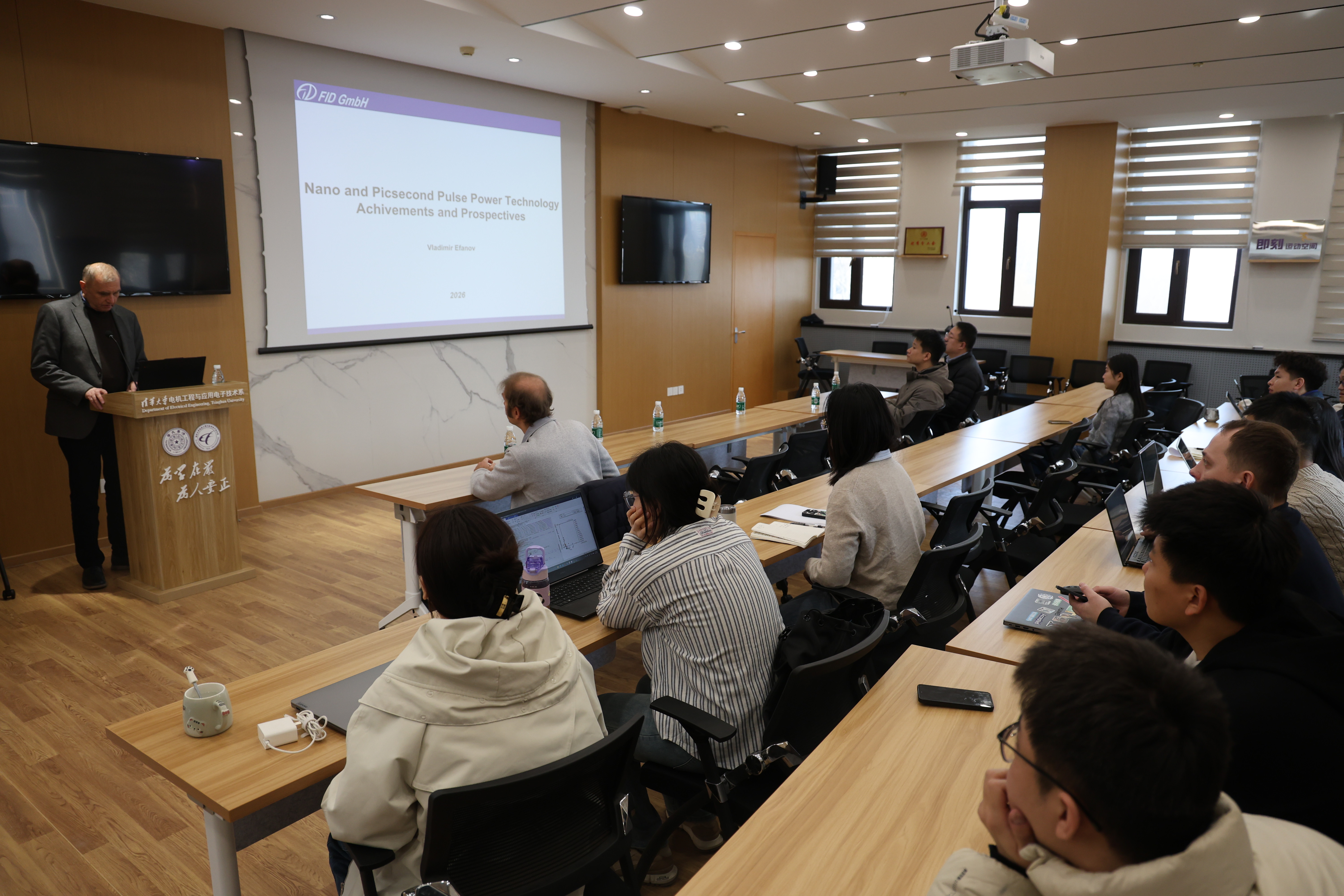 3月10日上午,德国FID GmbH创始人Vladimir Efanov受邀来访电机系并作了题目为“Nanosecond pulse power technology: achievements and prospectives”的学术报告。报告会由电机系副教授付洋洋主持,相关企业人员及电机系十余名研究生参加。