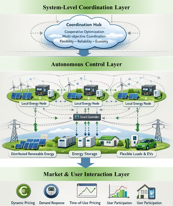 同一团队的“兼顾灵活—可靠—经济的绿色能源智能协同自治系统”荣获银奖。该系统面向高比例可再生能源接入的配电网和微电网场景,构建了一套涵盖系统级协调层、自主控制层与市场用户交互层的三层智能架构。