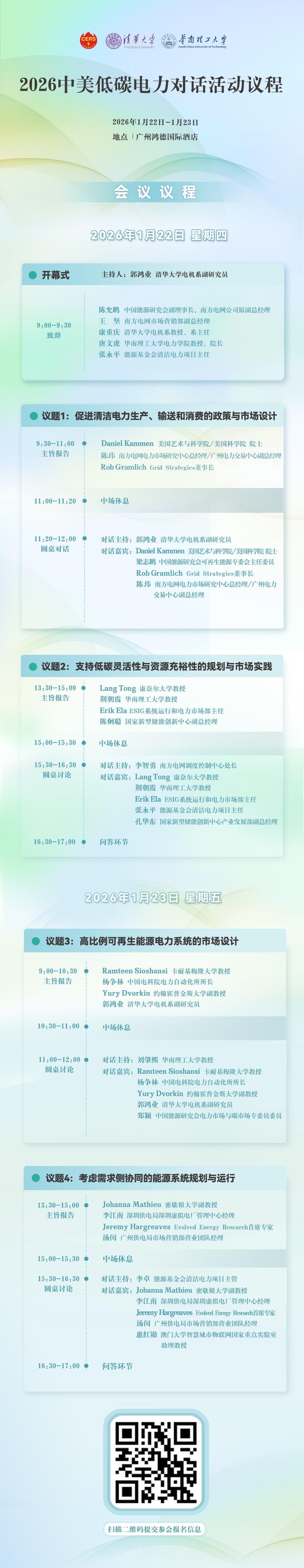 由中国能源研究会、清华大学及华南理工大学联合主办的第二届“中美低碳电力对话”将于2026年1月22日至23日在广州举办。本次活动在延续第一届高水平学术交流传统的同时,进一步引入了南方电网电力市场研究中心等产业界专业力量。本次参会的美方专家也同时覆盖学界与业界,既包括来自约翰霍普金斯大学、康奈尔大学、卡耐基梅隆大学、密歇根大学等高校的美国知名学者,也将有多位来自美国电力系统与能源政策咨询机构的资深专家参与。
