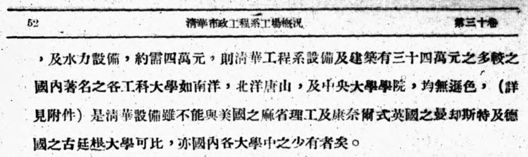1929年1月,时任国立清华大学市政工程系教师庄秉钧在清华周刊上发表了《清华市政工程系工场概况》。该文简要介绍了当时清华大学工程系各实验室的设备,并将投入资金与同期国内著名理工科大学对比,同时强调了实验设备对于科研、教学的重要性。庄秉钧在文中指出:“清华工科其设备究竟如何,当亦关心工程教育者所乐闻……清华工程系设备及建筑有三十四万之多,较之国内著名各工科之大学如南洋,北洋唐山,及中央大学学院,均无逊色,是清华设备虽不能与美国麻省理工及康奈尔式英国之曼却斯特及德国之古廷根大学可比,亦国内各大学之少有者矣。”[1]