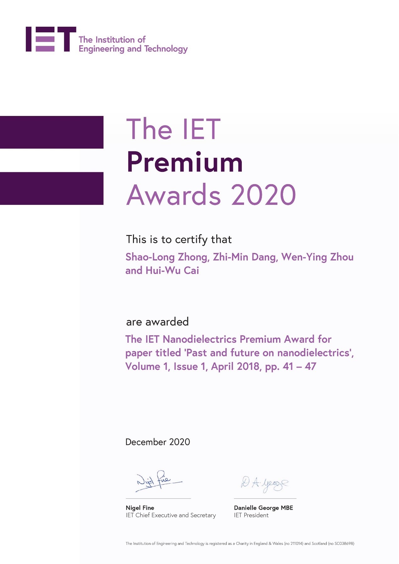 Recently, the paper "Past and future on nanodielectrics,Volume 1, Issue 1, April 2018, pp. 41-47" published in IET Nanodielectrics in 2018 by Dr. Zhong Shaolong (Supervisor Professor Dang Zhimin) of the Department of Electrical Engineering and Applied Electronics was granted the Premium Award for Best Paper by the Institution of Engineering and Technology. The award is annually granted annually by IET to highly influencing papers published in the series IET journals in the past two years (2018.1-2019.12), and only one paper is nominated for each journal. Polymer nanocomposite dielectrics have attracted wide attention because of their excellent properties. This paper analyzes the structure-activity relationship between structural properties and dielectric properties of polymer nanocomposites from the perspectives of time domain, space and interface, and systematically summarizes and explores the future application and orientation of polymer composite dielectrics.