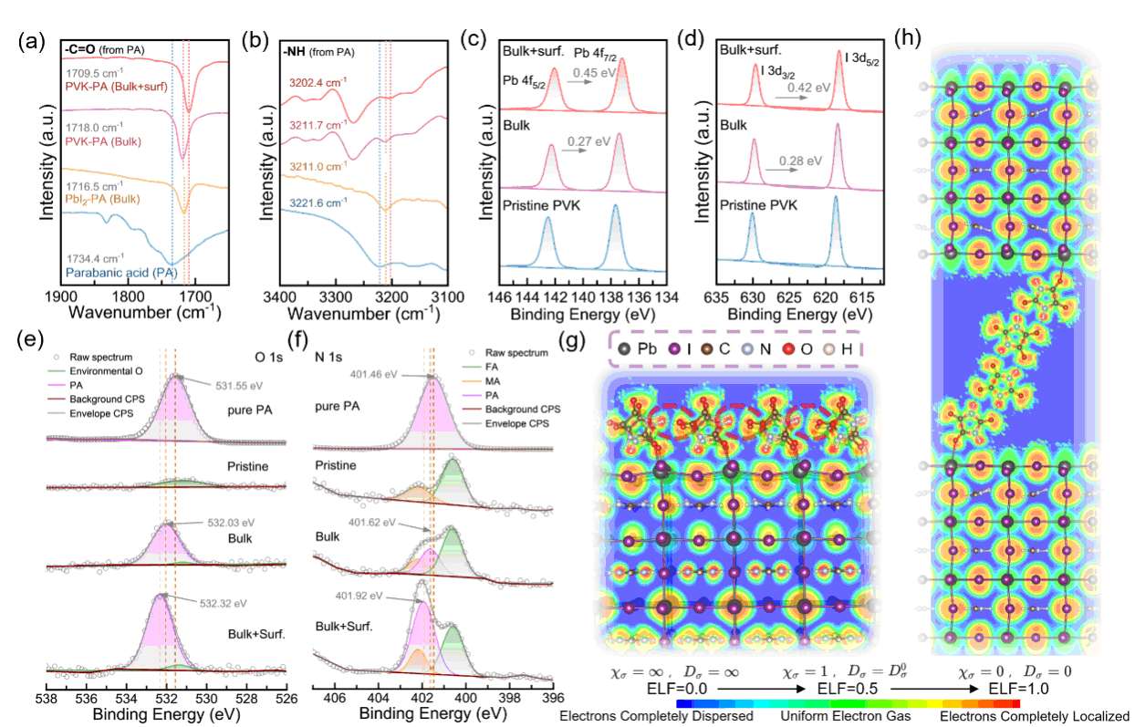 Fourier-transform infrared spectroscopy (FTIR) and X-ray photoelectron spectroscopy (XPS) revealed the interaction mechanisms between PA and the perovskite structure. Specifically, the carbonyl group (-C=O) in PA coordinates with lead (Pb) ions in the perovskite, and the amino group (-NH) forms hydrogen bonds with iodine (I) ions. Density functional theory (DFT) calculations further supported these findings, elucidating the mechanisms by which PA regulates crystallization and passivates surface defects in perovskite materials.