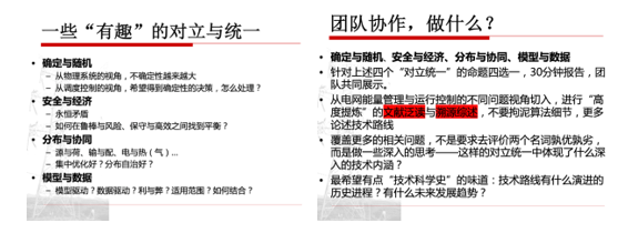 以往课程教学中选定的研讨内容是一些与课程相关的技术主题,比如“含可再生能源的电力系统调度”、“综合能源系统”、“大数据与人工智能”等,可以认为是这一领域技术问题的“横断面”。在本学期授课中,为了增加课堂讨论深度,尤其是增加学生之间在线下的“思维碰撞”,体会团队协作科研的过程,我们在课程研讨过程中增加了新的“讨论维度”——从“纵断面”入手。在前8周的课堂讲授内容中,老师为同学们描绘了能量管理系统技术发展的历史脉络、关键技术和发展前瞻,希望同学们能进一步通过文献调研和小组讨论,从中提炼和发现本学科解决问题的“共性路线”,从“技术哲学”的高度进行深入思考。以下是课程设计的四个思考主题,从“对立统一”的角度让同学们开展研讨。