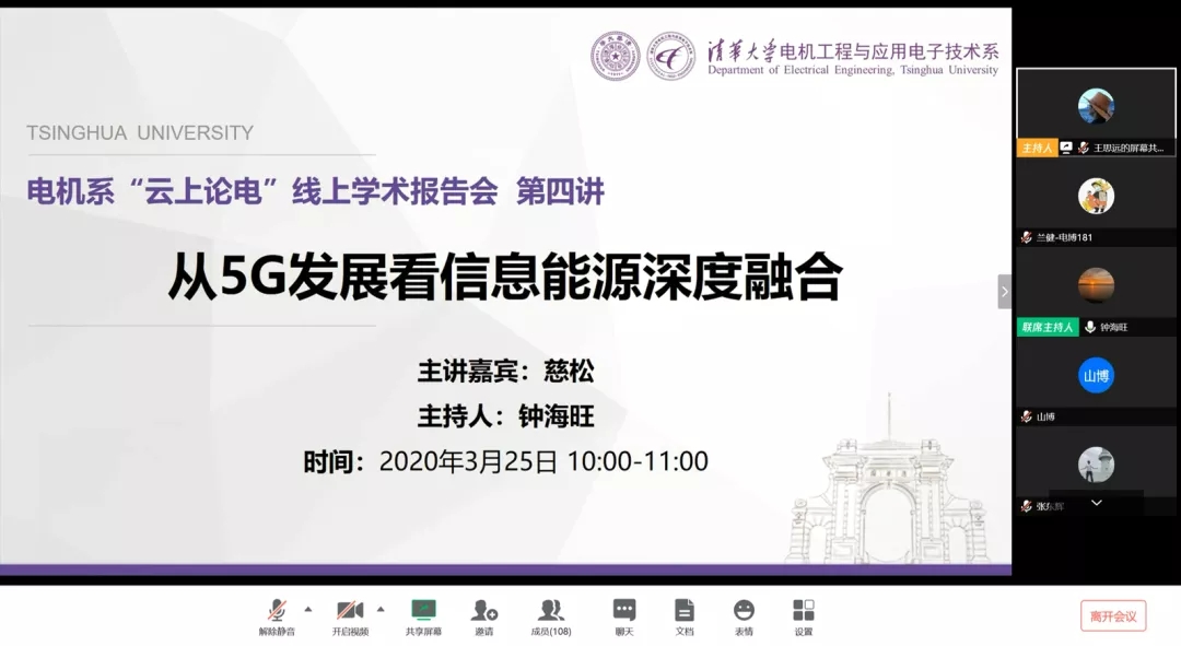 2020年3月25日上午10时,电机系利用腾讯会议网络平台,举办了第四期“云上论电”线上学术报告会活动,本场报告会邀请了清华大学电机系慈松研究员,围绕5G发展与信息能源深度融合这一热点话题展开专题学术分享。校内师生、社会各界专家学者等超过一百一十人一同参加了本次活动,线上学术报告会由系党委研工组组长钟海旺主持。