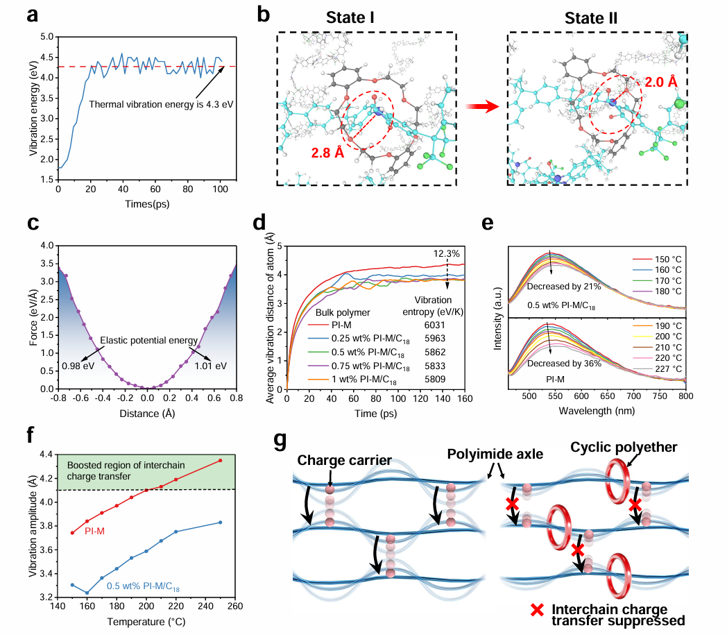 进一步,课题组为了限制声子辅助的链间电荷隧穿,利用超分子化学方法将冠醚类环形分子穿套在线形的聚酰亚胺分子链上,形成具有聚轮烷结构的介电高分子。第一性原理计算和分子动力学模拟结果显示,冠醚类环形分子和聚酰亚胺分子链之间形成的机械键能够将振动能转变为弹性势能,从而抑制高温下聚合物分子链的局部振动和声子辅助链间电荷转移。这种“分子阻尼器”使得这类具有聚轮烷结构的介电高分子在极端高温、高电场下能够克服主要电导机制。