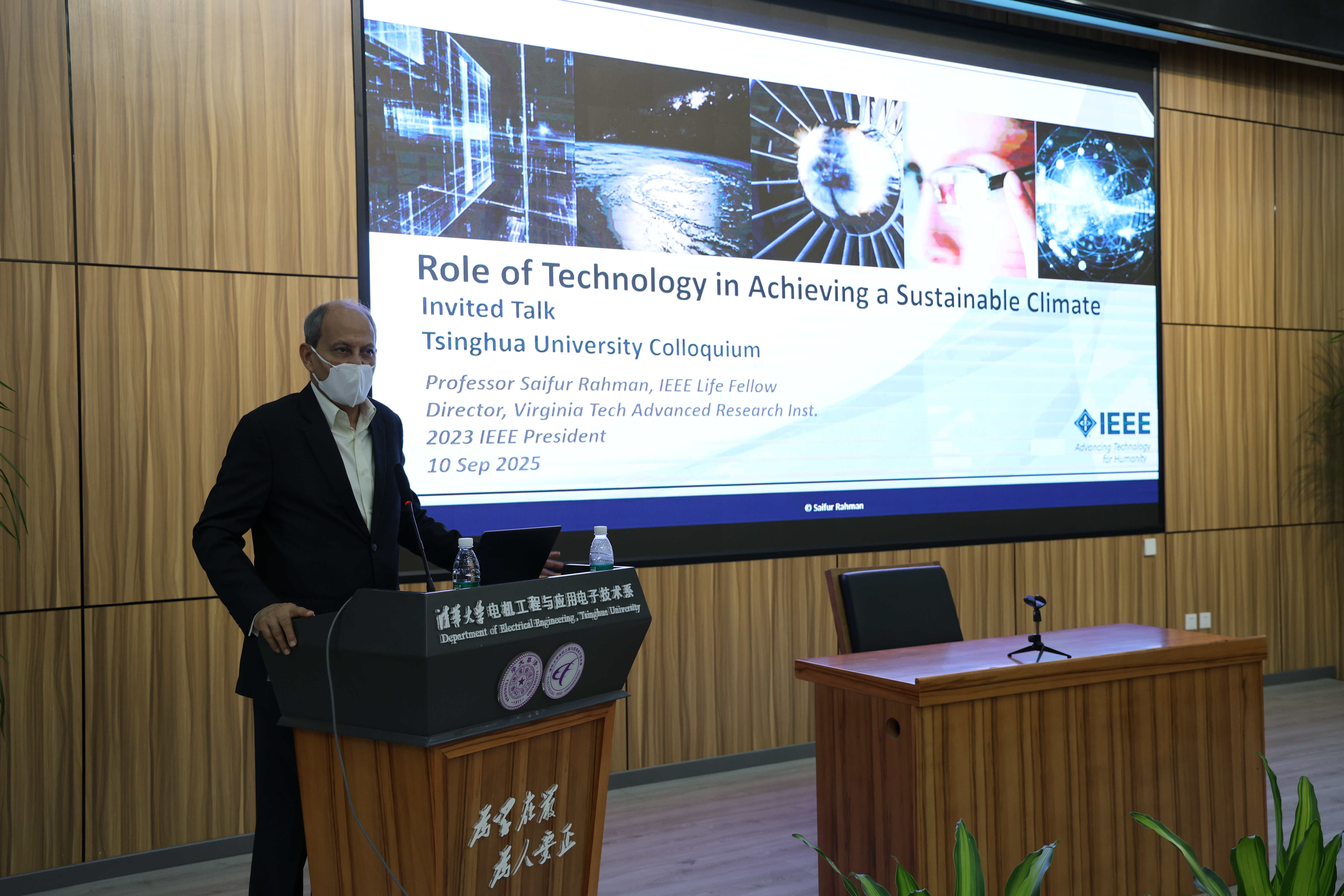 9月10日上午,国际电气与电子工程师协会(IEEE)2023年度主席、美国弗吉尼亚理工大学教授Saifur Rahman到访电机系,并作题为“Role of Technology in Achieving a Sustainable Climate”的特邀报告。美国艺术与科学院院士、约翰斯·霍普金斯大学彭博特聘教授Daniel Kammen,世界工程组织联合会能源效率组主席,中国电机工程学会原秘书长李若梅,IEEE 亚太区高级业务总监华宁,电机系主任、清华大学能源互联网创新研究院院长、清华四川能源互联网研究院院长康重庆等50余位师生出席讲座。