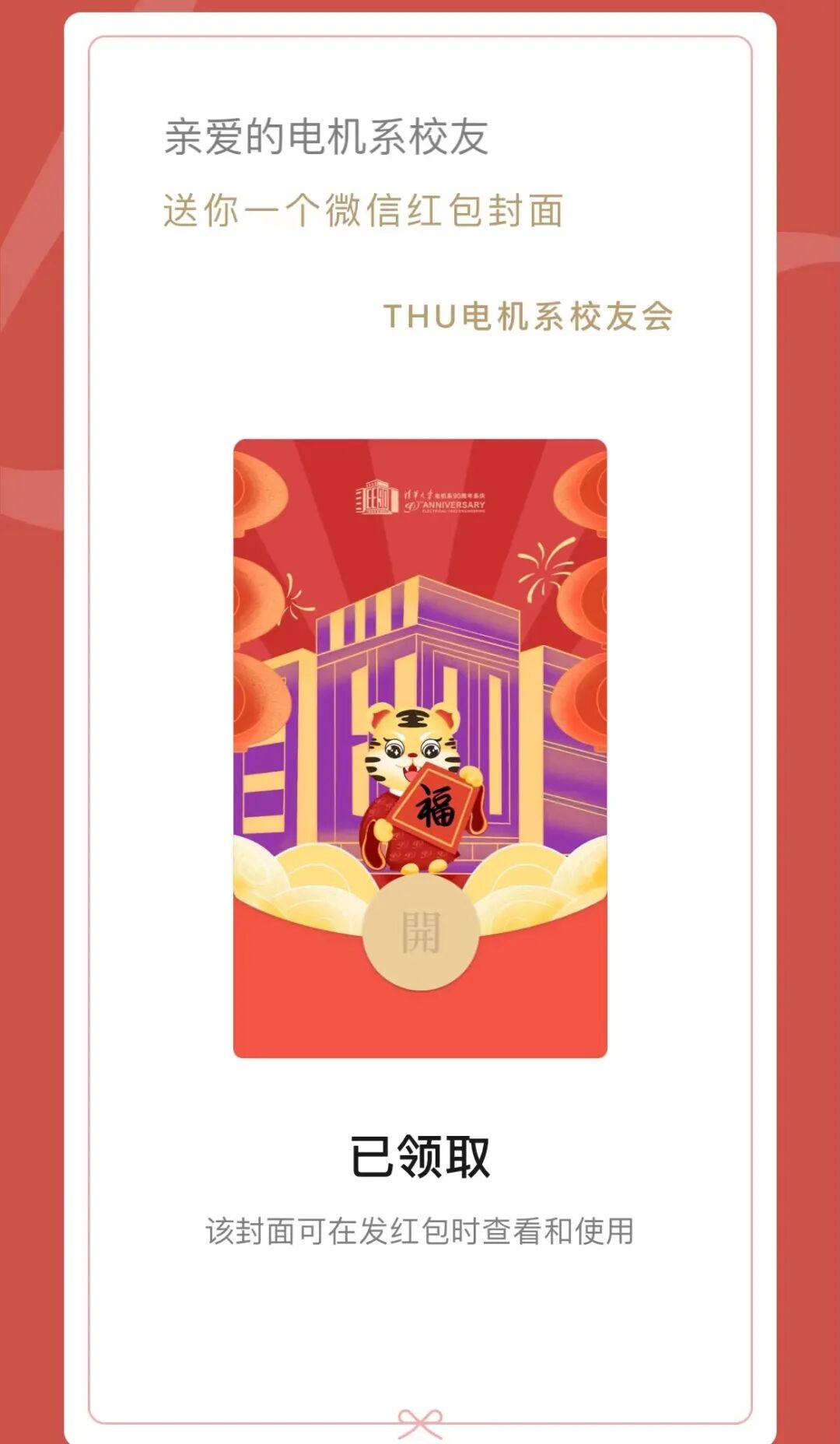 为迎接即将到来的电机系90周年华诞,电机系校友会特别定制了校友红包封面。